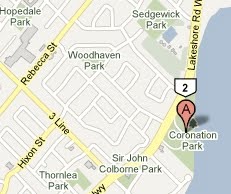 From the west, take the QEW past Bronte to 3rd Line. Drive towards the lake (south). Turn left on Lakeshore and Coronation Park will be on your right within a km. or so. Enter from the west, park, and look for the stage.