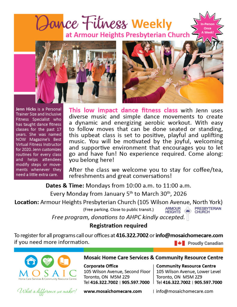 You are encouraged to register in advance, however, you will also be able to register in-person at the class. You can register in advance for one class, or multiple classes as you are available by contacting Priya Hawkins at priya@mosaichomecare.com, or 416-322-7002.